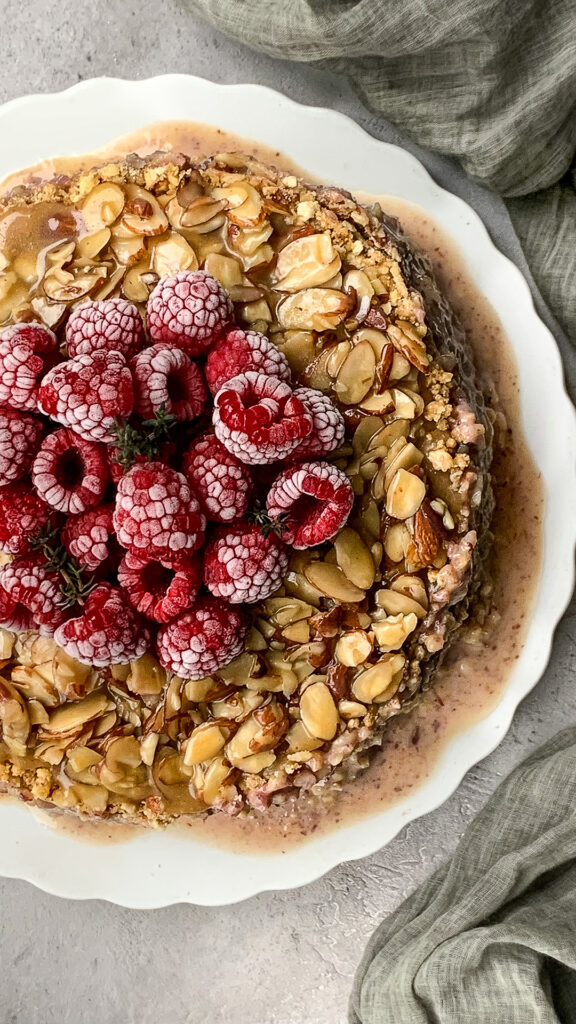 La tercera capa está compuesta por una mermelada, en este caso de frambuesa pero pudiera ser de algún otro fruto rojo como mora, arándano o fresa. Esta capa va en el centro de la torta. A mi me encanta el contraste de lo dulce con el ácido de la fruta. Si utilizas mermelada aseguráte que sea libre de azúcar para no sumarle más dulce a nuestra torta.